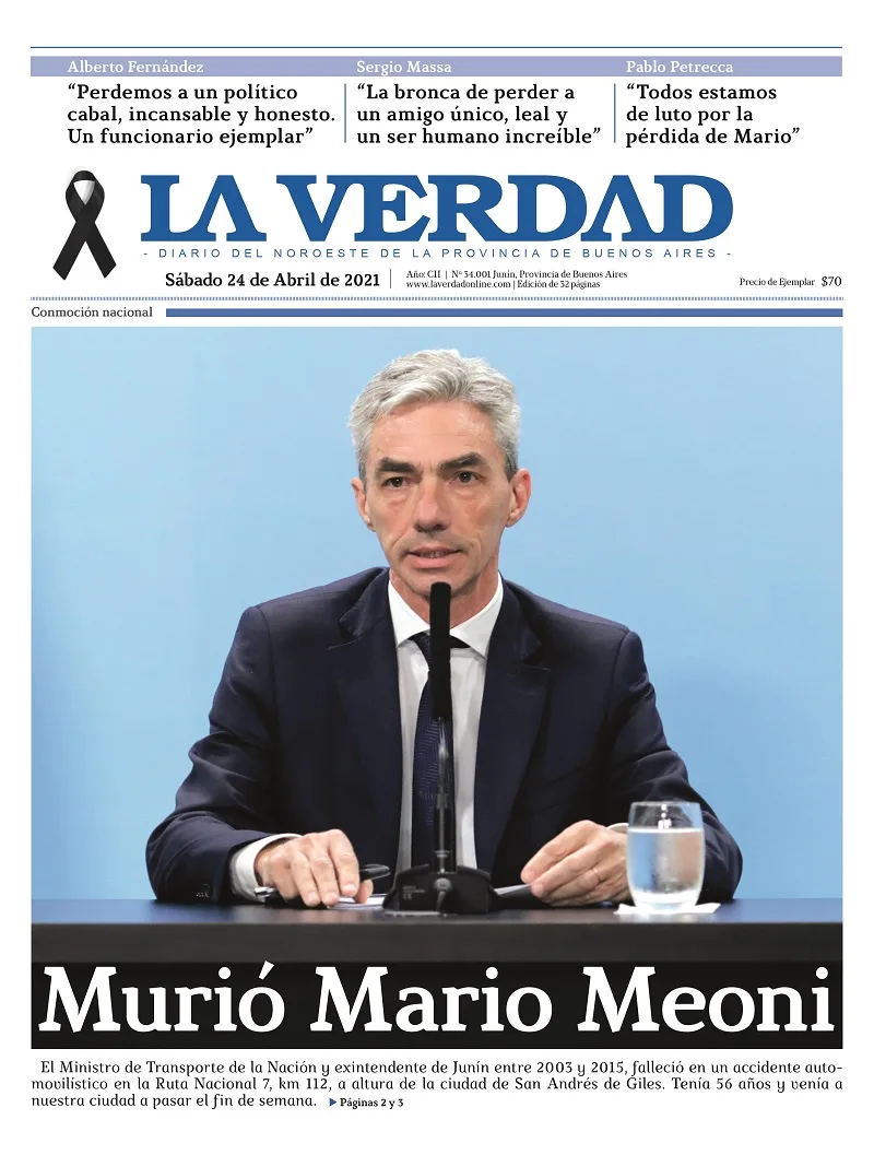 El ex ministro de Transporte de la Nación, Mario Meoni, murió el 23 de abril de 2021 a los 56 años, tras protagonizar un accidente de tránsito sobre la Ruta Nacional 7 cuando estaba viajando a Junín para visitar a su familia.