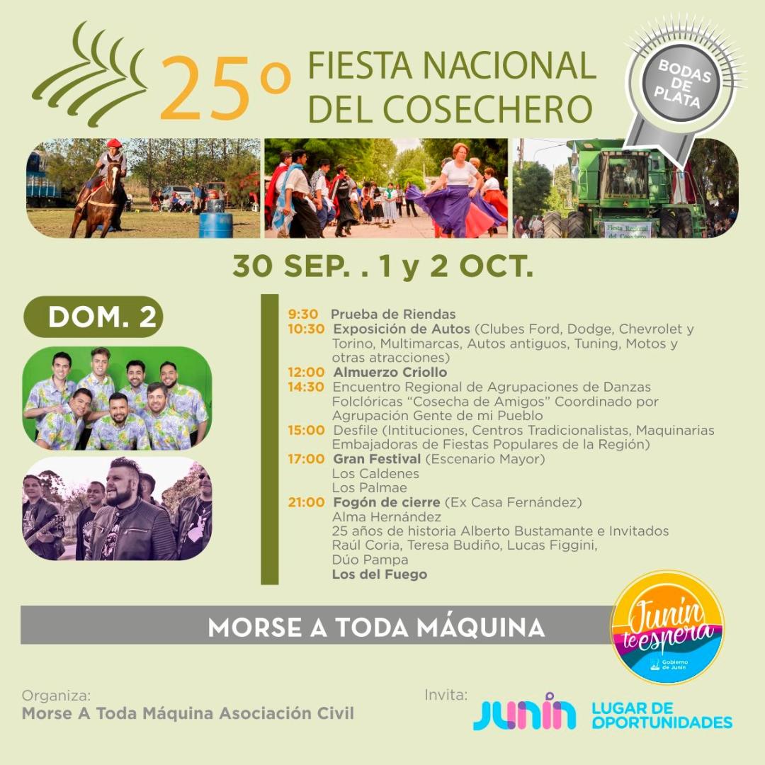 El domingo 2 a las 10.30 habrá una exposición de autos, el almuerzo criollo a las 12, un encuentro regional de agrupaciones de danzas folclóricas a las 14.30, el desfile de instituciones a las 15, Gran Festival a las 17 y el fogón de cierre a las 21 con el cierre estelar de Los Del Fuego.
