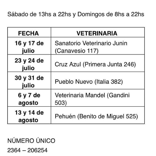En las últimas semanas, a partir de una decisión originada desde el Círculo de Veterinarios –una entidad que fue reimpulsada en Junín-, un grupo de profesionales se organizó para prestar atención a las mascotas durante los fines de semana, hasta las 22.