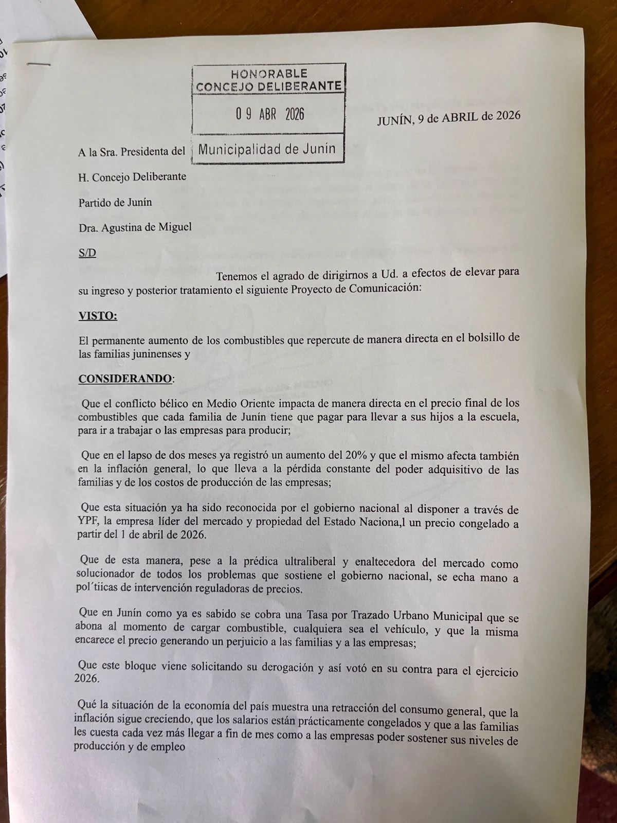 El bloque de concejales de Fuerza Patria presentó un proyecto de comunicación en el Honorable Concejo Deliberante de Junín solicitando al Departamento Ejecutivo Municipal la suspensión del cobro de la Tasa por Trazado Urbano Municipal que se aplica sobre la carga de combustibles en la ciudad.