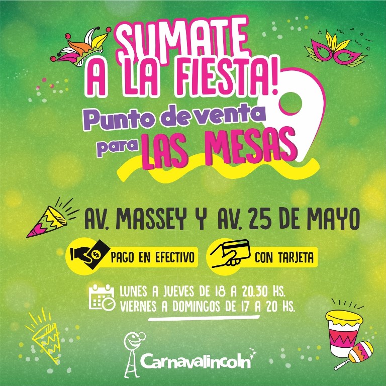 La Municipalidad de Lincoln informa que comenzó a funcionar el punto de venta físico, exclusivo para la compra de mesas. El punto de venta está operativo en el kiosco de la vereda del Palacio Municipal, en la esquina de Avenida 25 de Mayo y Av. Massey. Allí el público podrá abonar en efectivo y también con tarjeta. El horario de atención será de lunes a jueves de 18 a 20.30 y de viernes a domingos de 17 a 20.