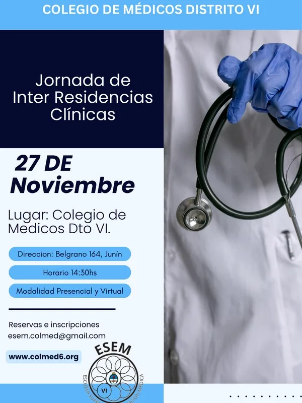 El próximo jueves 27 de noviembre se realizará en el Auditorio del Colegio Médicos de la Pcia. de Bs. As., Distrito VI -Belgrano 164- la Jornada de Inter Residencias Clínicas.