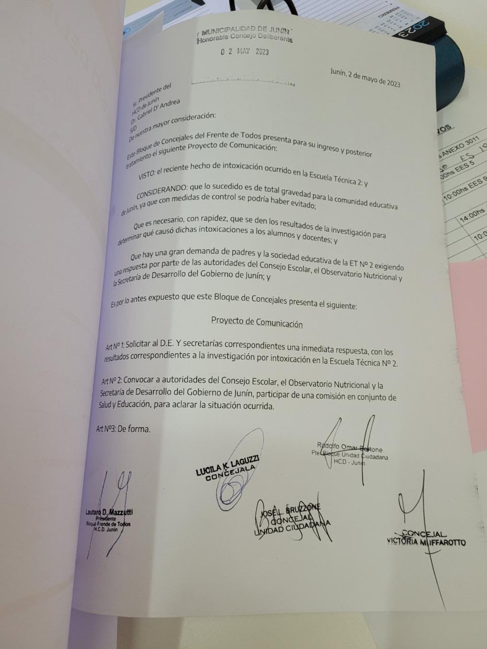 En las últimas horas, el bloque de concejales del Frente de Todos elevó un proyecto de comunicación en el cuerpo, solicitando información sobre los casos de intoxicación ocurridos en la Escuela de Educación Técnica Nº 2, y que motivó la suspensión del comedor del establecimiento durante algunos días de la semana pasada.