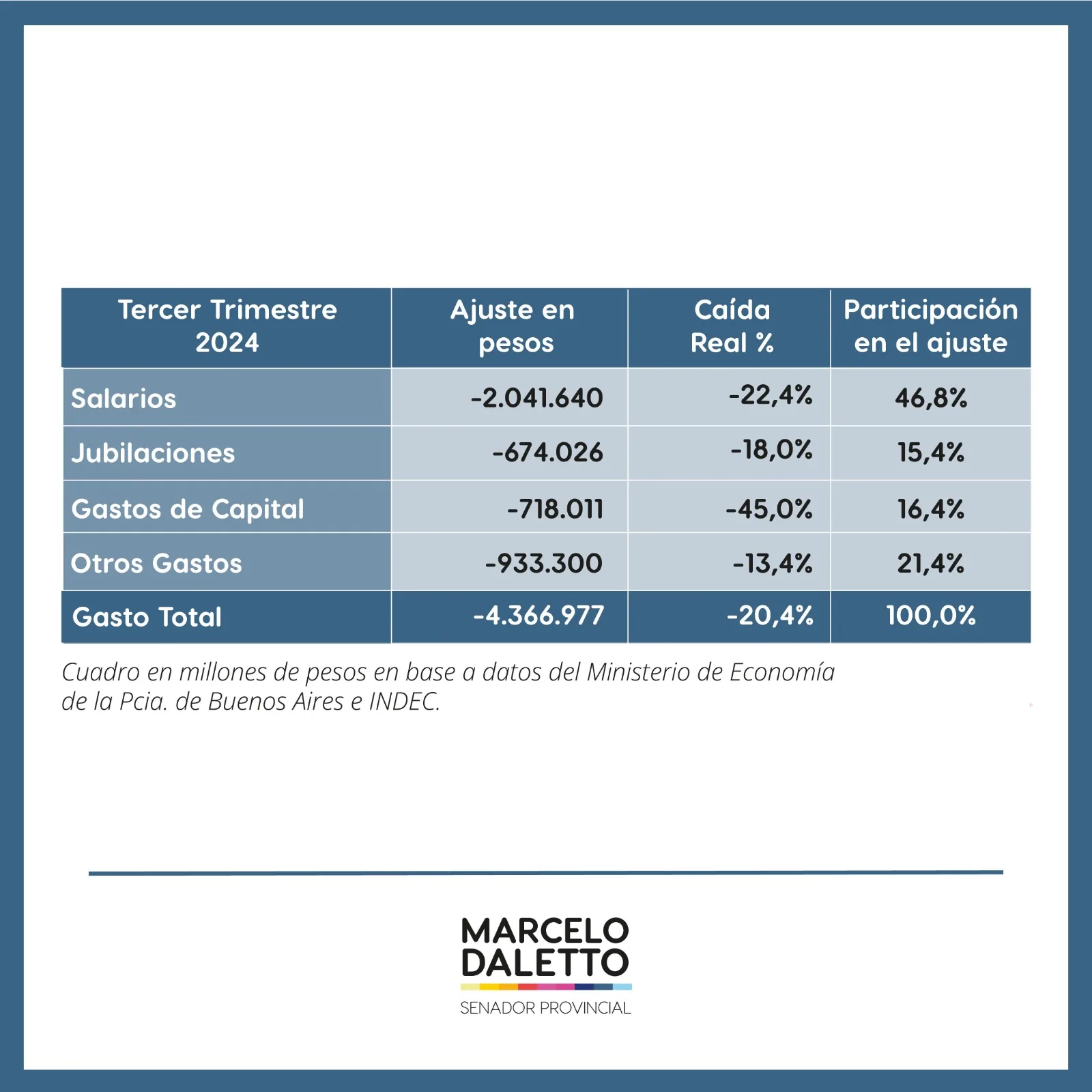 El senador Marcelo Daletto presentó su habitual informe sobre ejecución presupuestaria de la provincia de Buenos Aires y sostuvo que “si tomamos la última información oficial y comparamos los primeros nueve meses de gestión 2024 con el mismo período 2023, vemos que, en la práctica el ajuste de Kicillof continúa”.