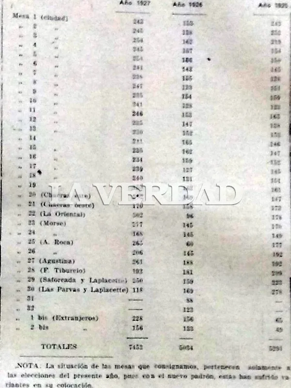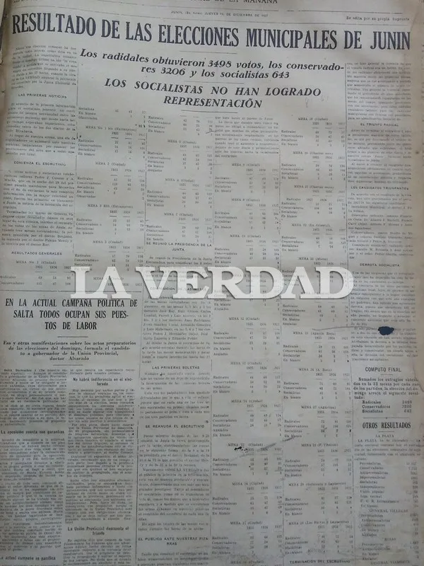 La Verdad, 1 de diciembre de 1927 – Dos de nuestros redactores se dirigieron ayer a Mercedes, donde se verifica el escrutinio de las elecciones municipales de la 4ta sección, con objeto de transmitir el resultado del escrutinio correspondiente a Junín.