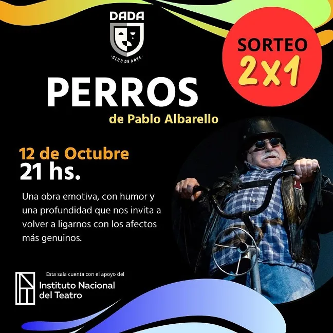 El sábado 12 de octubre a las 21, se montará la obra “Perros”, un unipersonal realizado por una compañía de General Rodríguez, con actuación Nacho Vavassori y dirección de Elvira Massa. Esta obra ya fue presentada en agosto del año pasado, en el Festival Nacional de obras del autor que se desarrolló en Dadá junto a otras cinco puestas de distintos puntos del país.