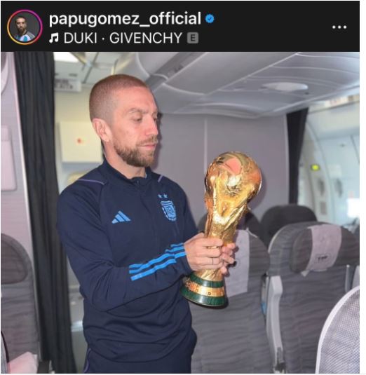 El primero fue el «Dibu» Martínez quién continuó con el chiste y mientras abrazaba la Copa manifestó: «Le pude hacer upa». Aunque sin comentarios, Messi también aprovechó mientras el avión cargaba combustible y subió una foto con el trofeo.