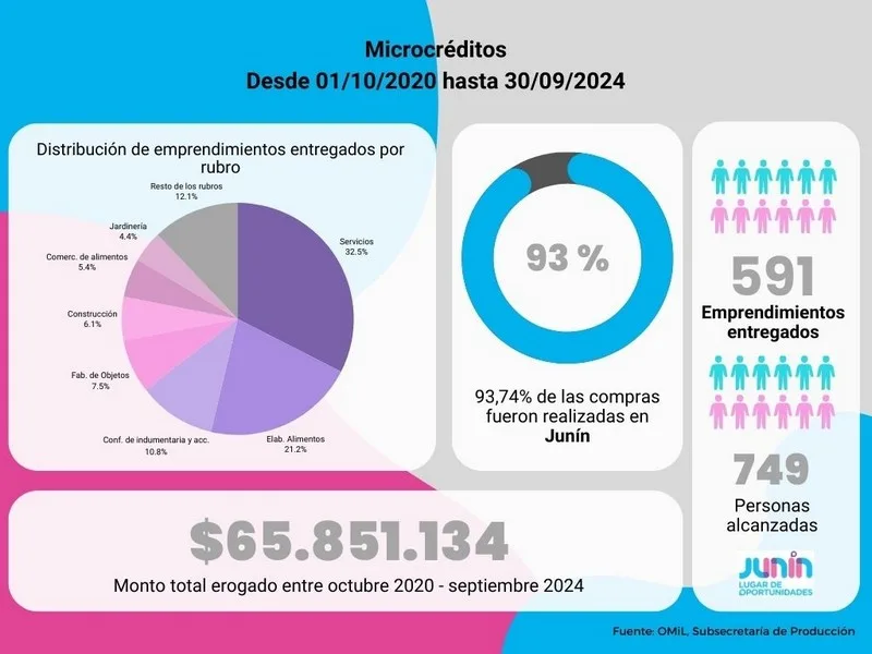 Como se indicó, y de acuerdo a las estadísticas oficiales informadas por la Subsecretaría de Producción del Municipio, hasta el mes de septiembre, en Junín hay 749 vecinos que fueron alcanzados con el programa, con un monto de créditos de $65.851.134 y se entregaron a un total de 591 emprendimientos.
