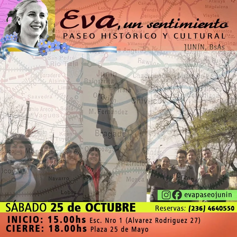 El sábado 25 se realizará nuevamente, el paseo histórico y cultural: “Eva, un sentimiento”. Va a recorrer los lugares donde Eva, dirigente política, la primera de nuestra historia, luchadora por la justicia social e igualdad de derechos, dejó su huella.