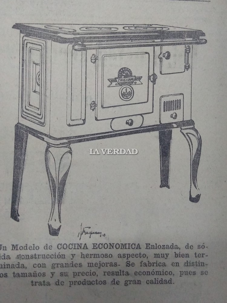 Don Pascual Cirigliano, hombre emprendedor y de iniciativas, ha logrado imponer las cocinas de su fabricación, que tienen franca aceptación en nuestro mercado. Numerosos obreros son ocupados en los amplios talleres de la calle Borges 1015, donde después de ser sometidas a verdaderos trabajos artísticos salen listas para ser entregadas al mercado las ya populares cocinas que han conquistado con todo el merecimiento, fama de insuperables. Las cocinas presentadas en este certamen, son esmaltadas, lo que les proporciona a las mismas, una belleza especial sin restarles nada de eficacia, haciendo en la práctica, más fácil su aseo.