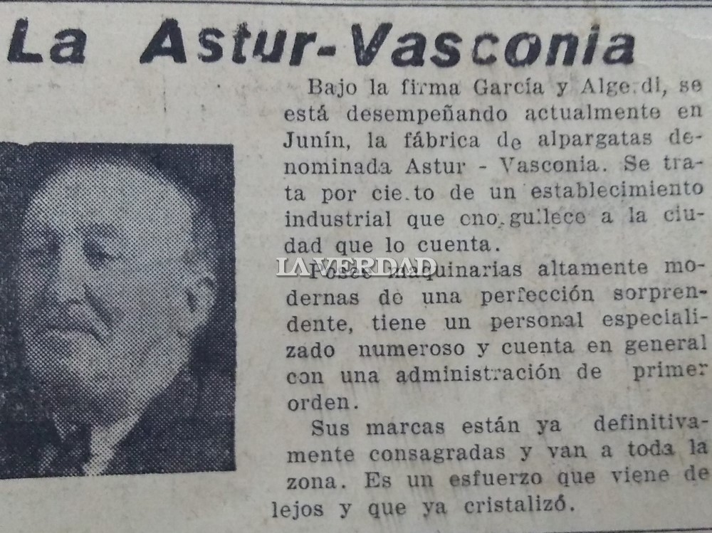 “El radio de acción en lo concerniente a la sección ventas, abarca la fabricación de zapatillas y alpargatas de lona. Hace 17 años que dos animosos comerciantes decidieron formar una sociedad, con el fin de explotar esa industria. Eleuterio García y Pedro Alberdi. Hombres pletóricos de vida mancomunados por idénticos ideales y aspiraciones y animados por una férrea voluntad, supieron salvar con altura e inteligencia los diferentes y múltiples obstáculos que se interponían entre ellos y la meta de sus afanes. Y triunfaron. Triunfaron porque a todo ello unieron lo imprescindible para salir victoriosos en la lucha por la vida: honestidad comercial, procedimientos escrupulosos, solvencia moral.