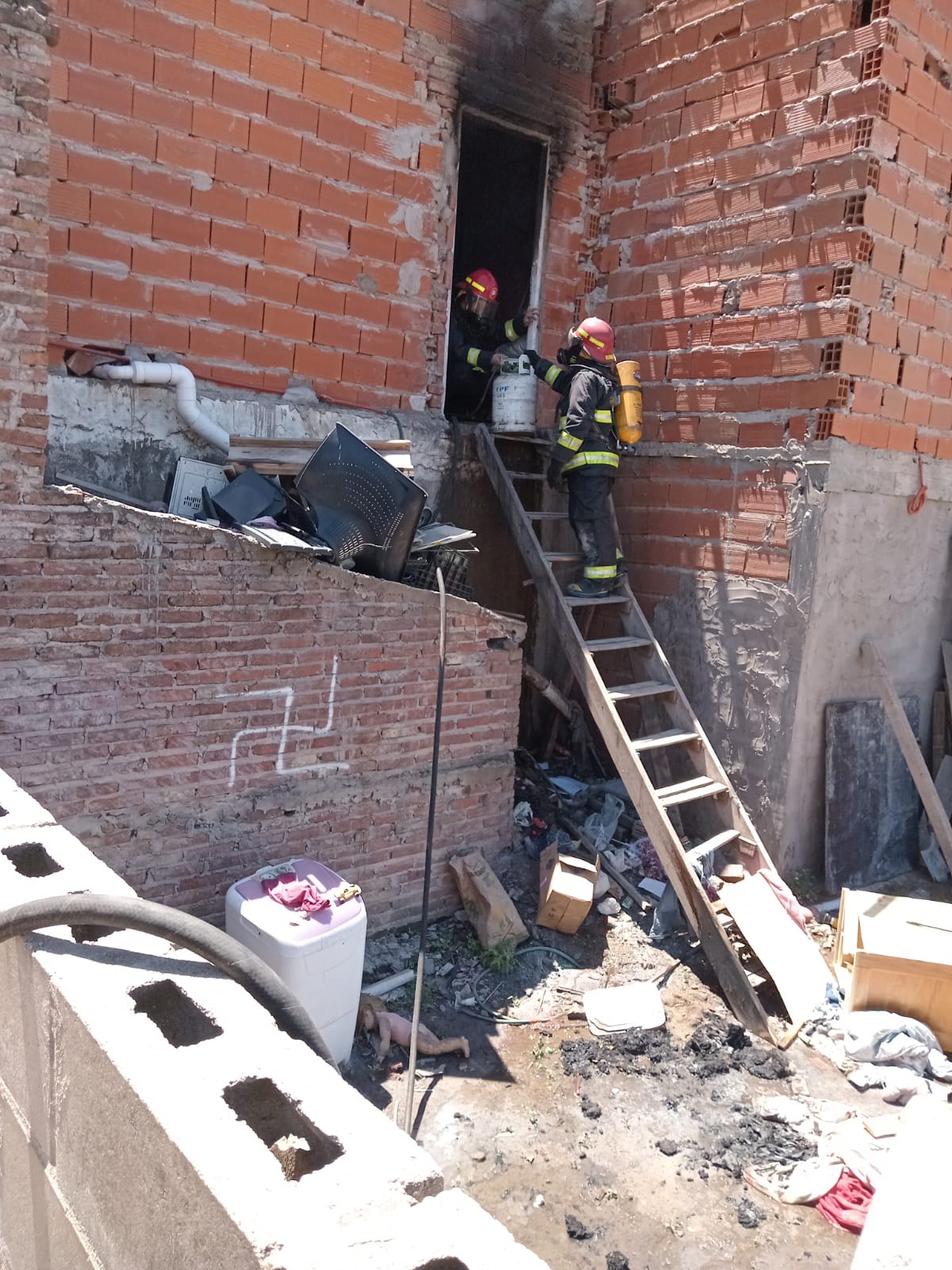 El ingreso del personal se realizó por otra vivienda lindera y atravesando un tapial para poder acceder al lugar del siniestro. No se encontraban personas al momento del incendio.