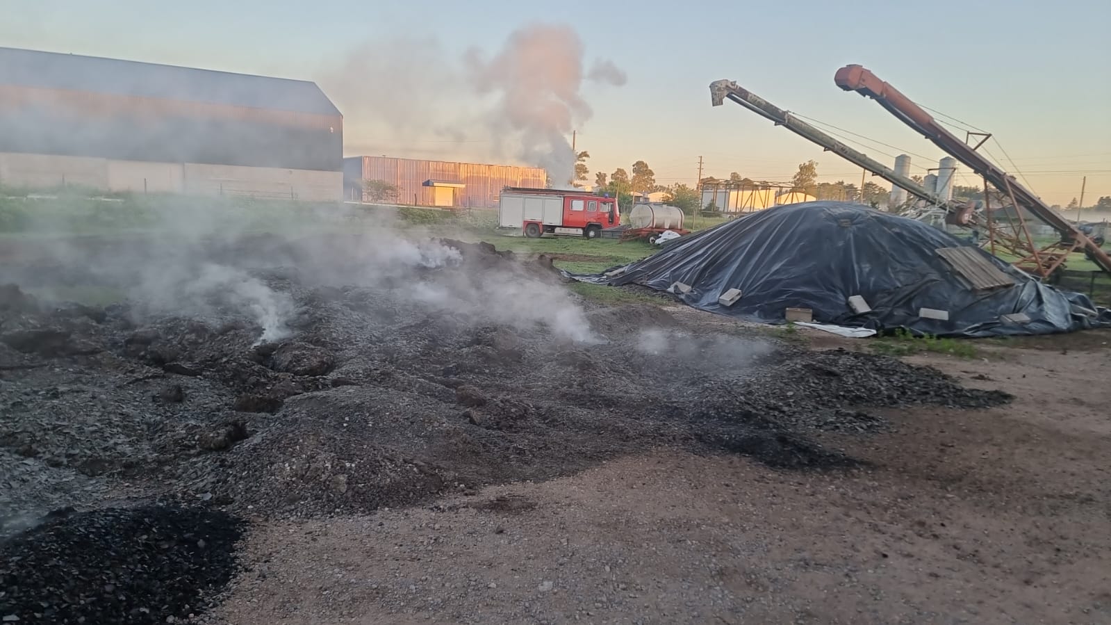 Al llegar al lugar, la dotación de incendio descubrió tres montículos de semilla de girasol compactada, con dimensiones aproximadas de 2 metros por 6 metros, que ardían.