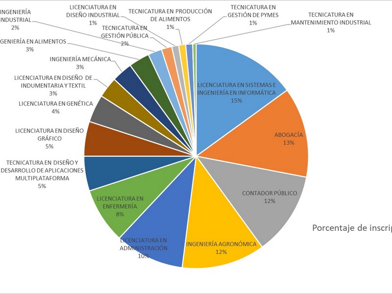 El informe preliminar aportado por la Secretaría Académica de la UNNOBA especifica datos porcentuales de inscripción para cada una de las carreras que forman parte de la oferta académica: