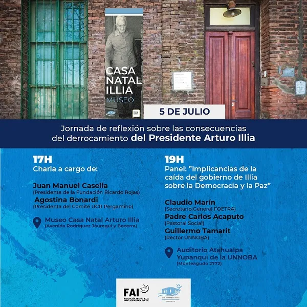 Se concretará hoy una jornada de reflexión sobre las consecuencias del derrocamiento del presidente Arturo Illia. La actividad es organizada por la Fundación Arturo Illia para la Democracia y la Paz y Casa Natal Illia- Museo.