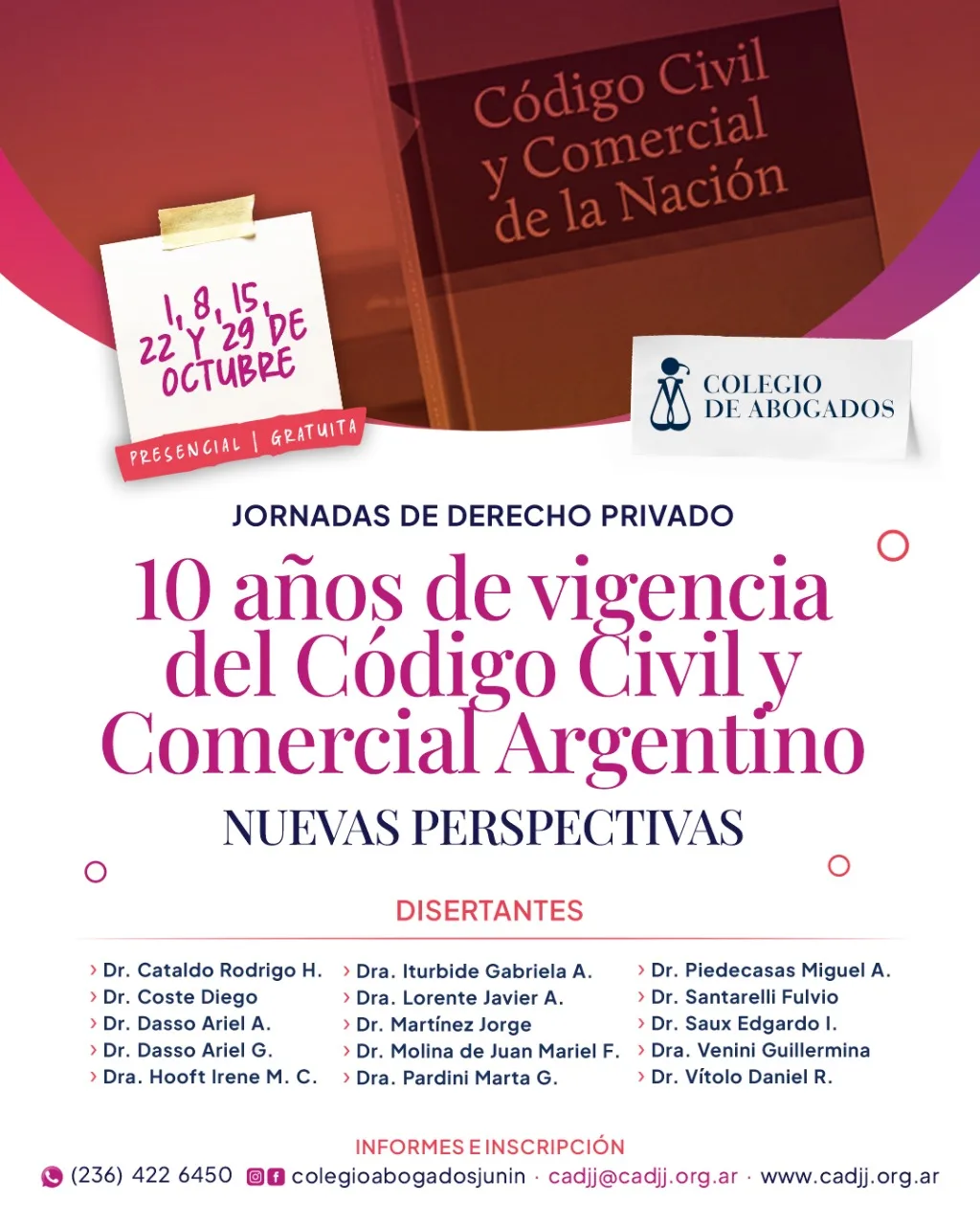 El Colegio de Abogados del Departamento Judicial Junín invita a participar de las Jornadas de Derecho Privado: «10 años de vigencia del código civil y comercial argentino. Nuevas perspectivas», las que estarán a cargo de importantes expositores, reconocidos y de gran trayectoria.