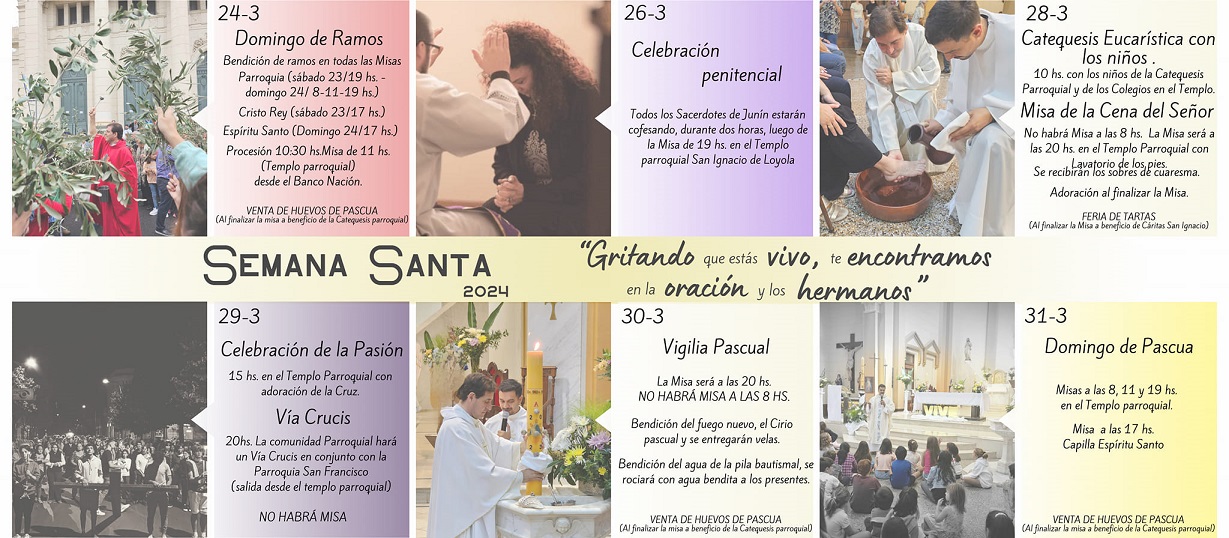 Además, el cura párroco de San Ignacio de Loyla apuntó que “en la Semana Santa recibiremos la especial visita de nuestro Obispo Jorge Eduardo, quien estará en Junín durante la semana que viene. Presidirá la misa de la última cena el día jueves, a las 19, en la Parroquia San José, y el viernes estará confesando en la Iglesia San Ignacio durante la mañana”.