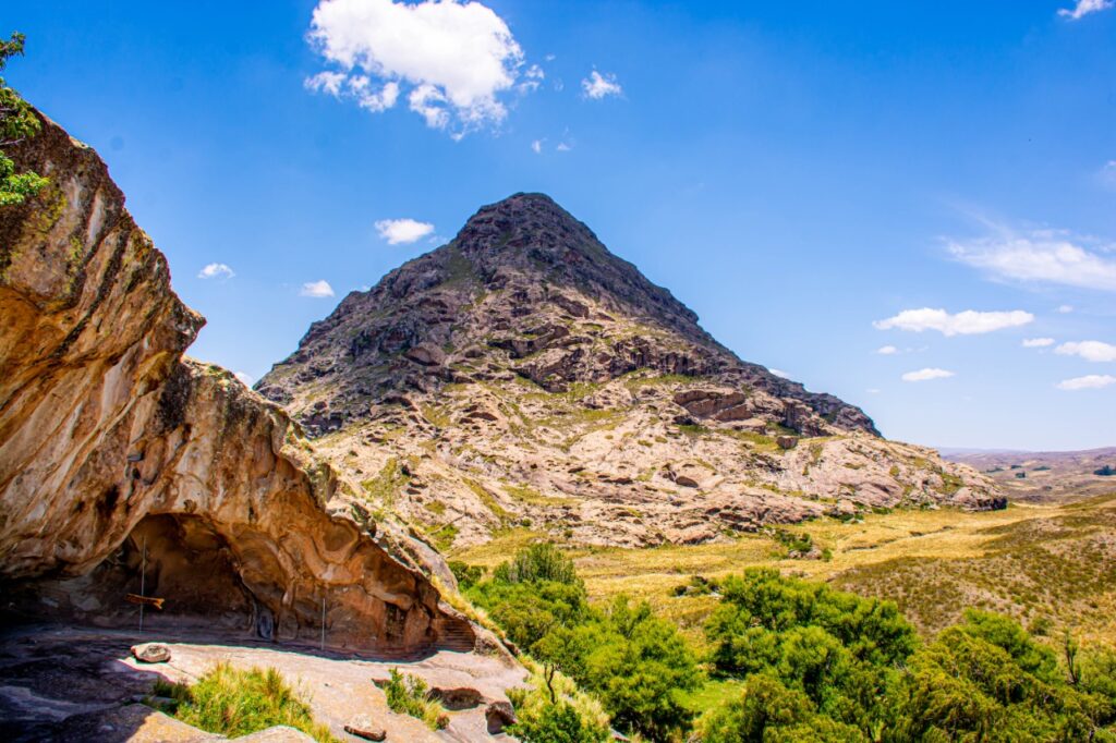 La siguiente estación es la Gruta Inti Huasi, unos 20 km más adelante en ese camino de ripio. Se trata de un domo andesítico de origen volcánico situado en la zona central de las sierras de San Luis. Allí fueron encontrados restos óseos y líticos de la cultura “Ayampityn”, que habitó la región 6.000 años a.C.