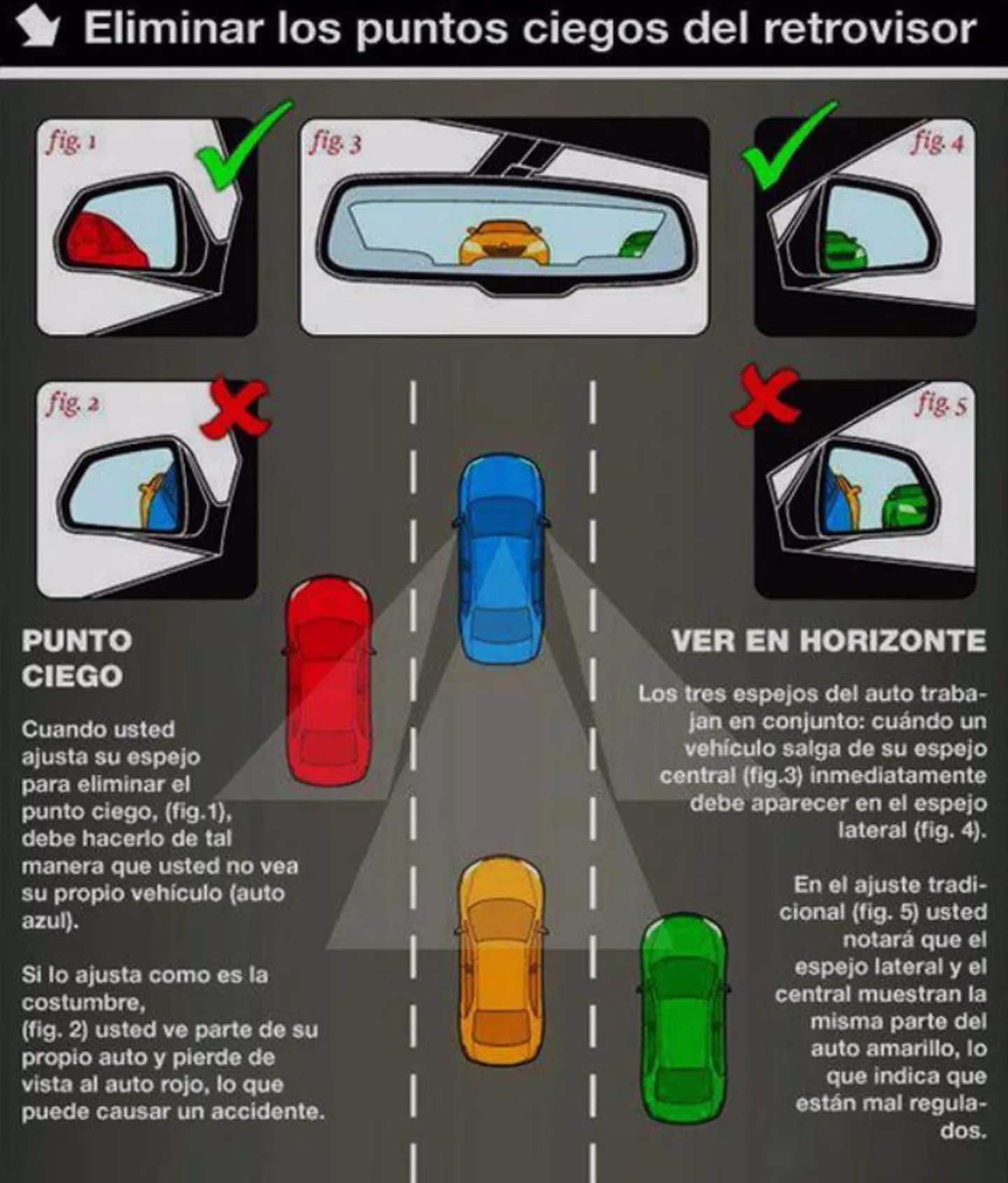 Los tres espejos retrovisores trabajan en conjunto: cuándo un vehículo salga del espejo central inmediatamente debe aparecer en el espejo lateral.