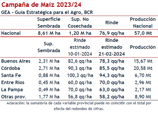 En este nuevo informe explicó: “La ola de calor también impactó en el maíz ya que se estima una caída en la estimación de producción de 3,4% frente al guarismo de enero. Con un rinde de 76,9 quíntales por hectárea a nivel nacional, se prevé una producción de maíz 2023/224 de 57 M/t. El recorte es de 2 millones de toneladas respecto de la cifra estimada en enero”, señaló.