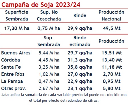 Además, la estimación de febrero también consideró un ajuste en el área nacional de siembra, con una reducción de 100.000 hectáreas. Con una superficie sembrada de 17,3 millones de hectáreas, un 8,3% más que el año anterior, y un rendimiento promedio nacional de 29,9 quintales por hectárea, se espera que la producción total de soja alcance los 49,5 millones de toneladas, lo que representa un aumento significativo luego de los 20 millones de toneladas de la sequía del año pasado.