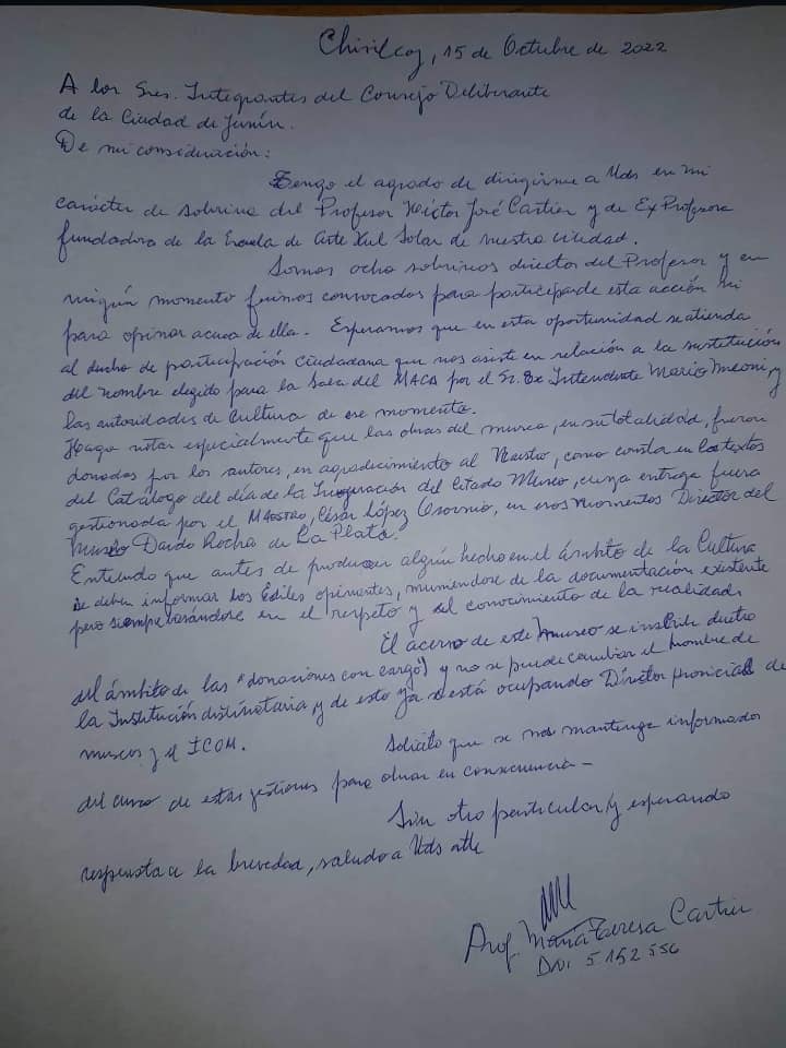 “Tengo el agrado de dirigirme a Udes. en mi carácter de sobrina del Profesor Héctor José Cartier y de ex profesora fundadora de la Escuela de Arte “Xul Solar” de nuestra ciudad.