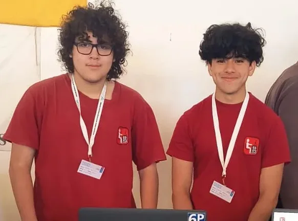 Los estudiantes Bautista Alonso y Agustín Cabral, acompañados por la profesora Lorena Genta, presentaron un collar inteligente para ganado vacuno, diseñado a partir del diálogo con productores locales y orientado a resolver problemáticas reales del sector agropecuario.
