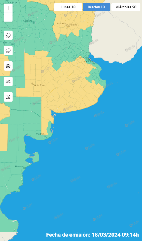 En tanto, el miércoles se esperan fuerte vientos para todo el oeste y norte, para la zona del Río de La Plata (incluyendo CABA, La Plata y conurbano) y parte del sur bonaerense de costa marítima.