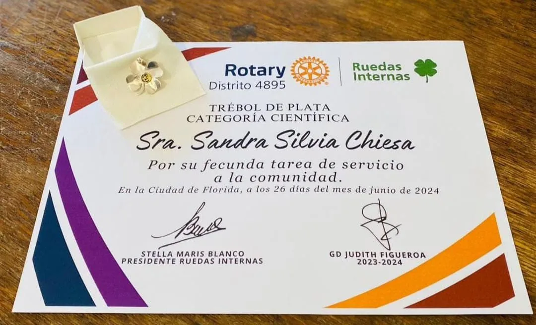 En el Rotary Club Florida de Buenos Aires, la farmacéutica Sandra Silvia Chiesa recibió el reconocimiento “Trébol de Plata, Mujeres que crean Esperanzas”, en la Categoría CIENTIFICA.