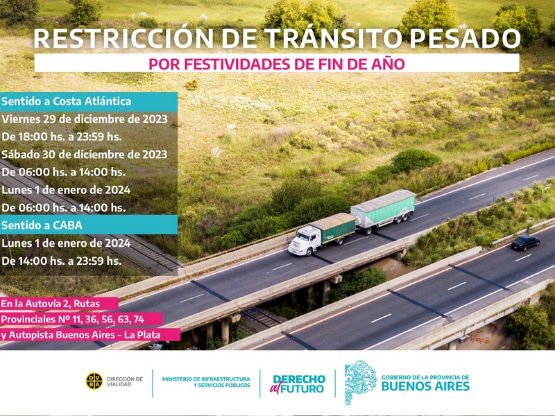 La Dirección de Vialidad de la Provincia de Buenos Aires, dependiente del Ministerio de Infraestructura y Servicios Públicos, comunica que por las festividades de Fin de Año, los días viernes 29, sábado 30 y lunes 1 de 2024, se restringirá la circulación de camiones con carga de más de 7 (siete) toneladas de porte bruto en la Autovía 2, las Rutas Provinciales Nº11, Nº36, Nº56, Nº63, Nº74, y la Autopista Buenos Aires–La Plata, con el objetivo de facilitar el desplazamiento vehicular y prevenir siniestros de tránsito en rutas turísticas.