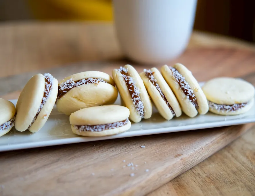 Una vez que vean que las tapitas están doraditas, las vamos a sacar. Una vez que estén frías, armar los alfajores. Pueden agregarle el coco rallado por al rededor.