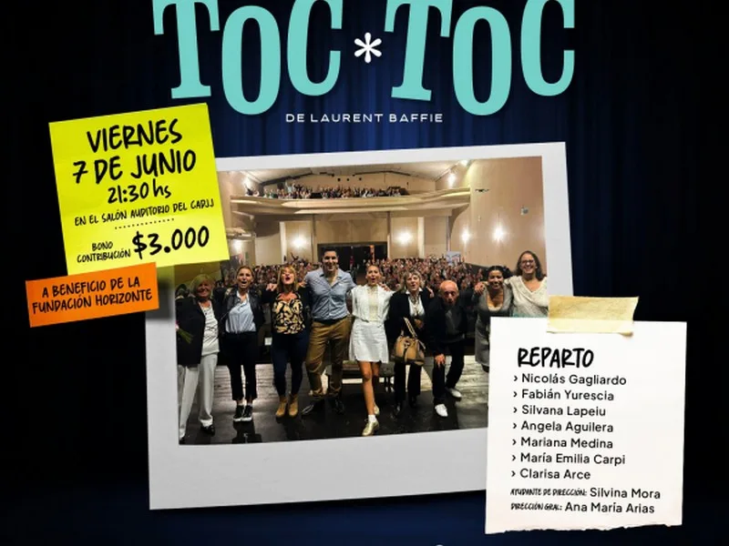 El próximo viernes 7 de junio en el salón auditorio del Colegio de Abogados departamental Junín, Bartolomé Mitre 83, se presentará la obra de teatro Toc Toc. El espectáculo es a beneficio de la Fundación Horizonte.