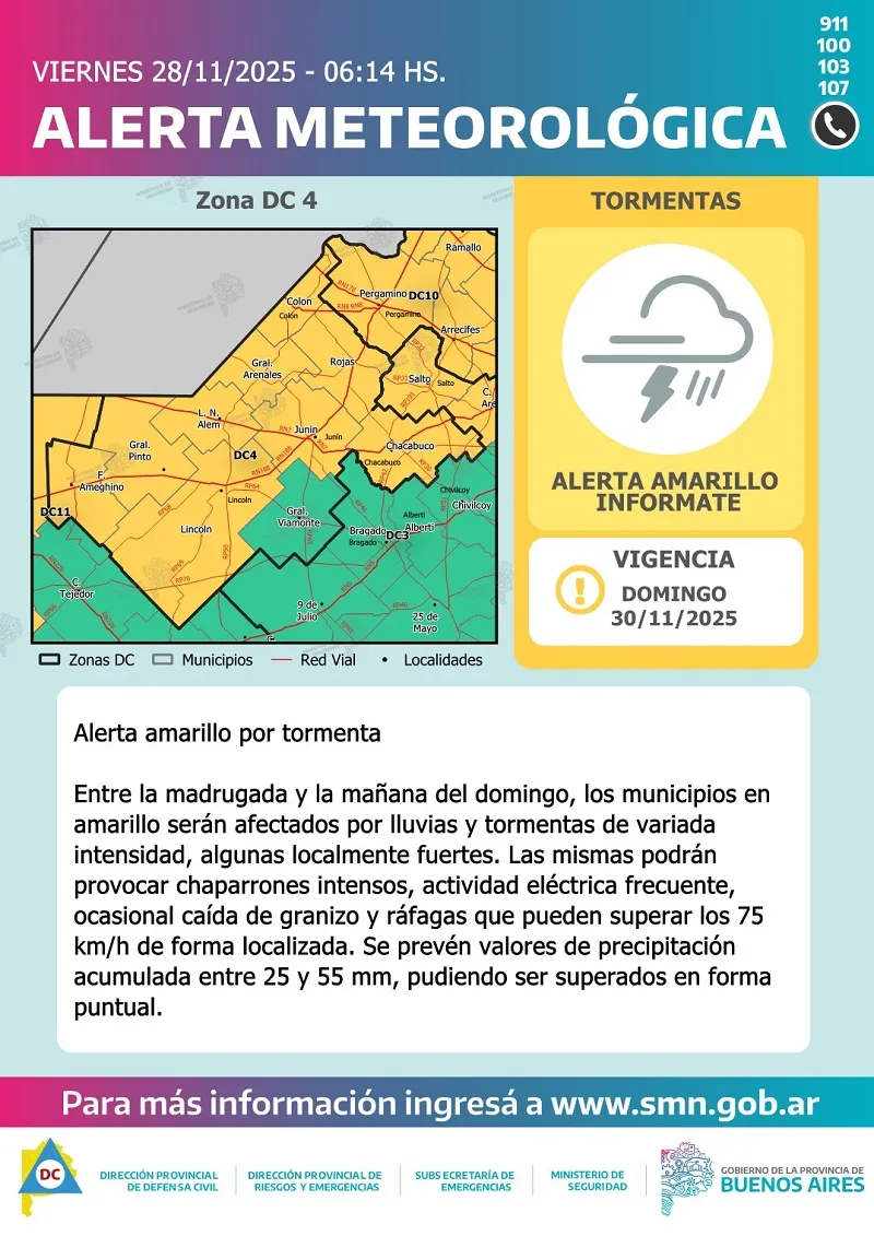 Hacia el final de la noche de hoy viernes, se prevén condiciones inestables sobre el extremo noroeste de la provincia de Buenos Aires, extendiéndose al norte provincial durante la madrugada del sábado. Si bien hacia el final de la noche del viernes podrían registrarse algunas tormentas fuertes en el extremo noroeste, es más probable que ocurran durante la madrugada del sábado.