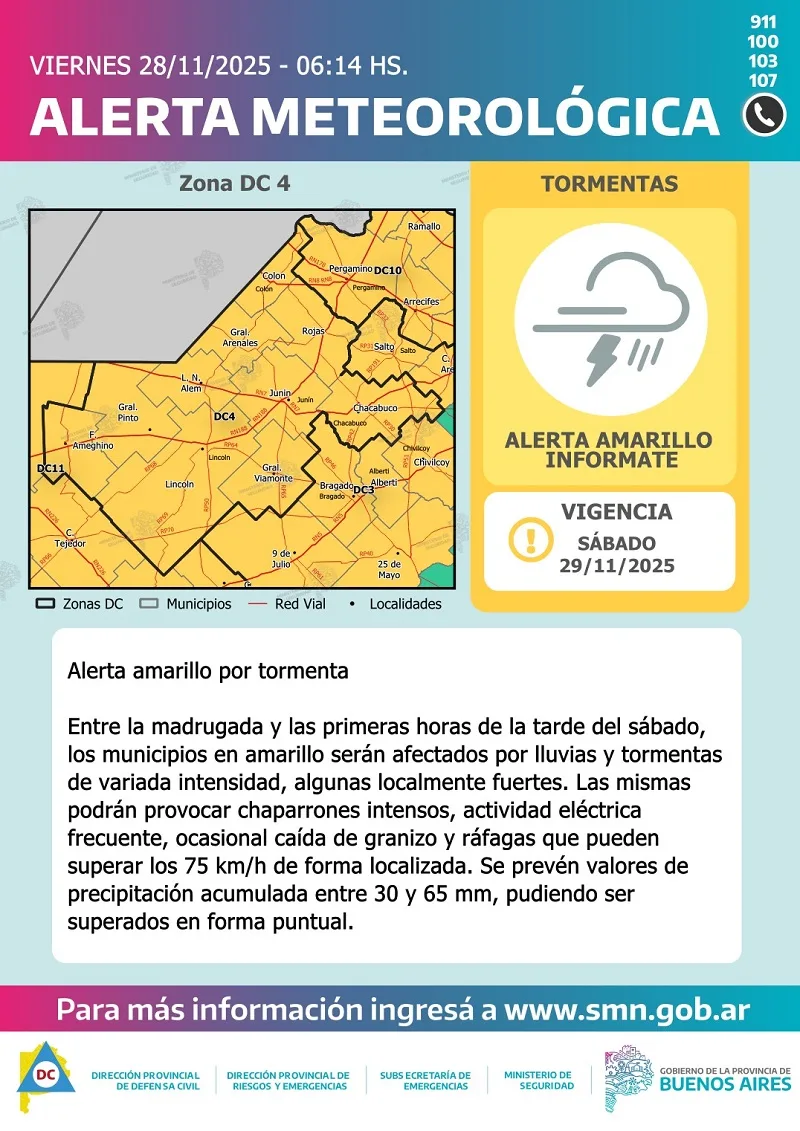 Hacia el final de la noche de hoy viernes, se prevén condiciones inestables sobre el extremo noroeste de la provincia de Buenos Aires, extendiéndose al norte provincial durante la madrugada del sábado. Si bien hacia el final de la noche del viernes podrían registrarse algunas tormentas fuertes en el extremo noroeste, es más probable que ocurran durante la madrugada del sábado.