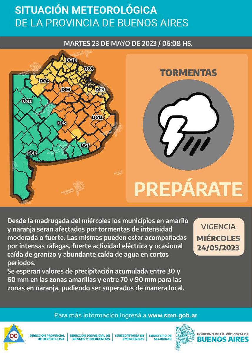 Tal como anticipó ayer DIB, el Servicio Meteorológico Nacional (SMN) avisó que gran parte de la provincia se verá afectada mañana por tormentas. En un primer momento la alerta era solo “amarilla” (el nivel más leve), pero ahora el organismo elevó la misma a “naranja” para varios municipios.
