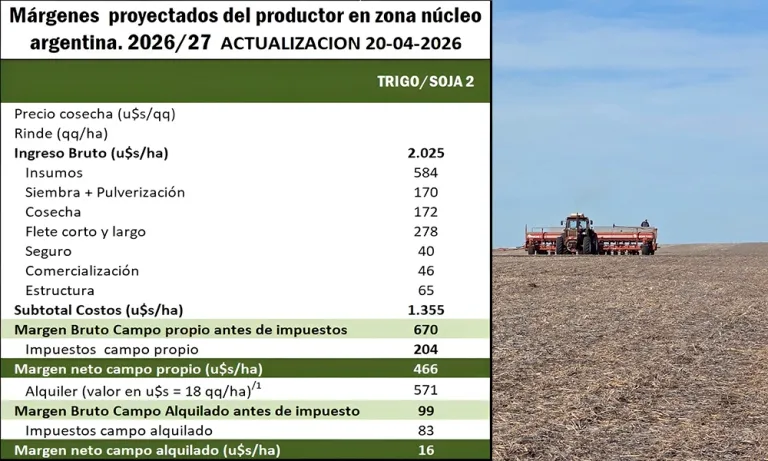Con cálculos actualizados al 20 de abril, un rendimiento objetivo de 40 qq/ha y un precio de cosecha de US$ 217 por tonelada, el margen neto después de impuestos se ubica en apenas US$ 65 por hectárea en campo propio. En campo alquilado la ecuación arroja una pérdida de US$ 128 por hectárea.