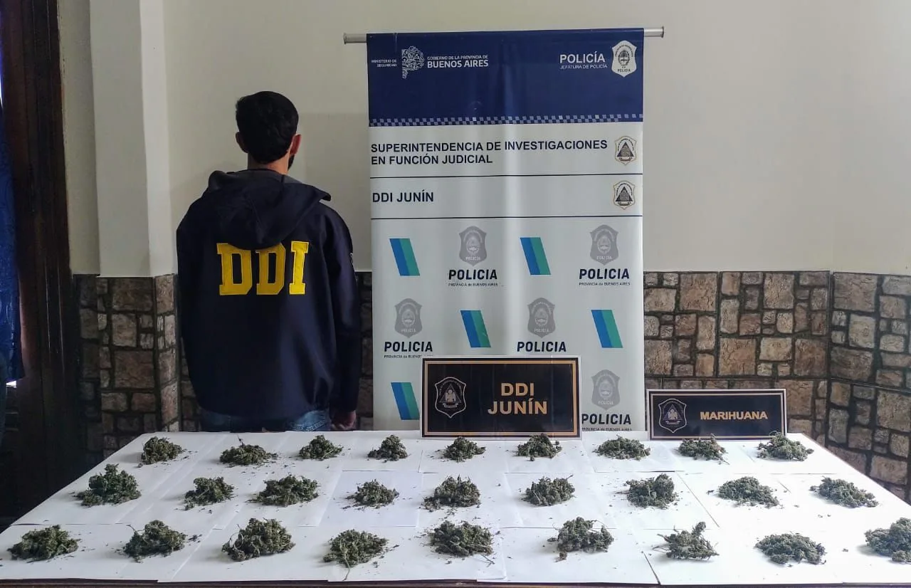 Efectivos de la DDI Junín, dando cumplimiento a una orden de allanamiento emanada por el Juzgado de Garantías Nro. 3 del Dpto. Judicial de Junín, en el marco de una causa por hurto, secuestraron una bolsa de nylon color negra que contenía en su interior cogollos de planta de marihuana.